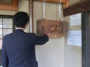 実施中の体験華道②(板木叩き) 板木を軽快に叩きました。